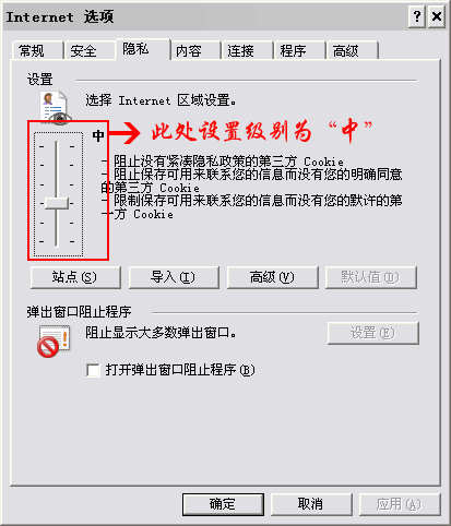 - 在打開的《Internet選項(xiàng)》窗口中,點(diǎn)擊《隱私》,如下圖所示操作后,點(diǎn)擊《確定》按鈕就可以了。(常用瀏覽器均支持,建議使用IE6以上版本)。