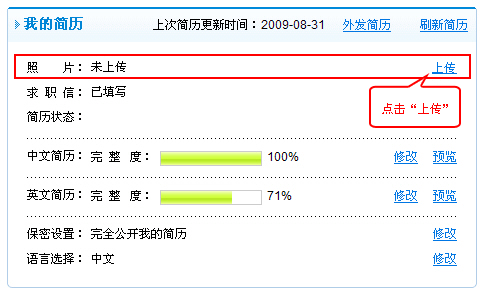 1.進(jìn)入《個(gè)人管理中心》首頁(yè),位于《我的簡(jiǎn)歷》版塊,點(diǎn)擊《上傳》。如下圖所示: