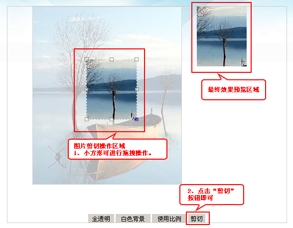 3.在打開(kāi)的頁(yè)面中,在圖片剪切操作區(qū)域,通過(guò)9個(gè)小方形獲得意向部份,按“剪切”按鈕即可。如下圖所示: